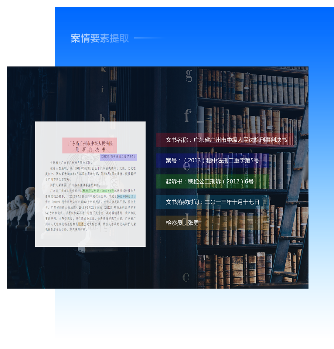 利用语义分词、命名实体识别、关键词提取等技术,实现案例精确搜索;基于专业词库深度学习,运用OCR技术,对案件各类原始材料进行识别